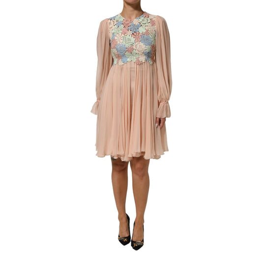 Dolce & Gabbana Pink Floral Embroidery Pleated A-line Dress