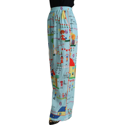 Dolce & Gabbana Light Blue Drawing Mid Waist Wide Leg Pants