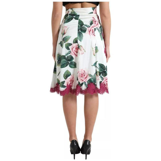 Dolce & Gabbana White Rose Print High Waist Midi A-line Skirt